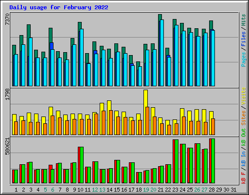 | Day | Hits | Files | Pages | Visits | Sites | kB F | kB In | kB Out | ||||||||
