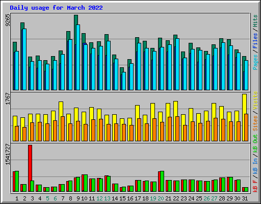 | Day | Hits | Files | Pages | Visits | Sites | kB F | kB In | kB Out | ||||||||